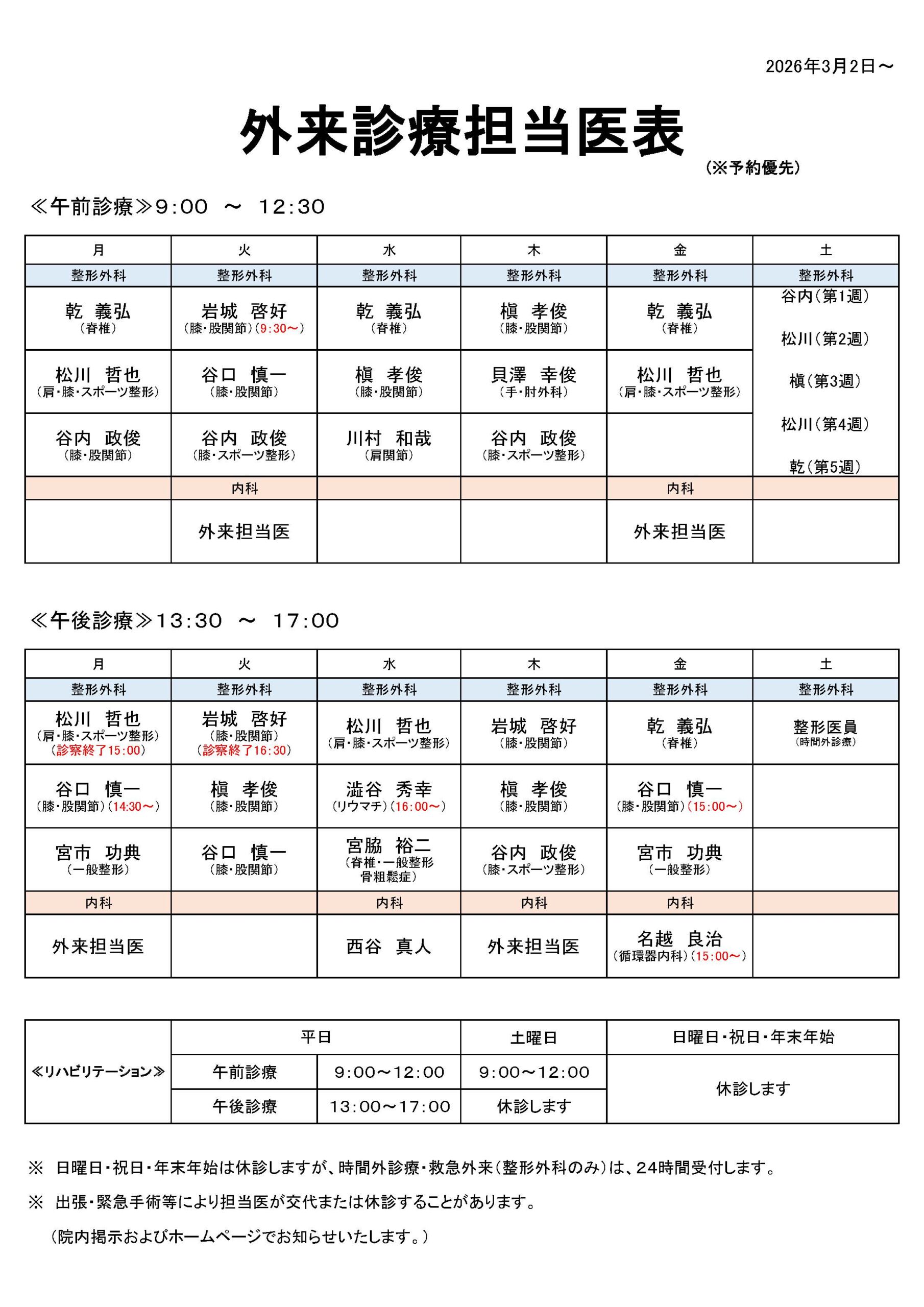 3月26日(木) 整形外科 岩城院長 13:30~14:30(最終受付14:15)